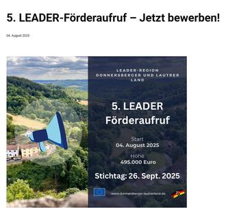 Im Rahmen des 5. LEADER-Förderaufrufes haben erneut interessierte öffentliche, private wie auch gemeinnützige Personen und Institutionen die Möglichkeit, ihre Projektideen beim Regionalmanagement einzureichen. Vorhaben, die gefördert werden können, sind solche, die innerhalb der LEADER-Region Donnersberger und Lautrer Land umgesetzt werden und zur Zielerreichung der Lokalen Integrierten Ländlichen Entwicklungsstrategie (LILE) beitragen. Dabei muss ein Vorhaben mindestens ein oder mehrere Handlungsfelder der LILE bedienen: