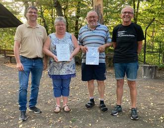 Im Rahmen dieses Festes wurden Ulrike und Herbert Scherer für ihr langjähriges und prägendes Wirken in der Ortsgruppe in mehr als vorbildlicher Weise und für ihr Werben für die Familien- und Jugendarbeit des Pfälzerwald Vereins geehrt. Beide haben herausragende Leistungen in der Ortsgruppe erbracht, z.B. haben beide bereits mehr als 900 Vereinswanderungen, Ulrike war von 1990 bis 2020 Rechnerin des Vereins, 2002 war sie Mitbegründerin der Jugendgruppe und als Jugendwartin, Ansprechpartnerin für alle Kinder und Jugendlichen. Des weiteren kümmerte sie sich um die Planung und Organisation der Veranstaltungen der Jugendgruppe. Für diese herausragenden Leistungen wurde Ulrike Scherer zum Ehrenmitglied der Ortsgruppe Olsbrücken ernannt. Herbert Scherer war von 1990 bis 2020 Mitglied der Vorstandschaft, von 1996 bis 2014 erster Vorsitzender und von 2014 bis 2020 Hüttenwart. In seiner Zeit als Vorstand waren seine größten Herausforderungen der Anbau der Vereinshütte, Aufbau des Verkaufsunterstandes und die Erneuerung der Sitzgelegenheiten des Vorplatzes. Er war auch Mitbegründer der Jugendgruppe und unterstützte Ulrike bei ihrer Jugendarbeit. Für diese außergewöhnlichen Leistungen in der Ortsgruppe wurde Herbert Scherer zum Ehrenvorsitzenden ernannt, die Ehrungen nahm der 2. Vorsitzende des Hauptvereins Dieter Gröger vor. Unsere Jugendgruppe feierte ihr Jubiläum mit verschiedenen Unternehmungen bis sonntags. Nach dem Frühstück schlug man die Zelte ab. Die Ortsgruppe Olsbrücken bedankt sich bei ihren Jugendwarten Bianca Eser und Florian Schneck für die Organisation und bei den vielen Helfern, die das Jubiläumswochenende möglich machten.