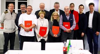 Gruppenfoto nach der Ehrung (v.l.n.r.): Hans Ernst, Michael Rellensmann, Andreas Kaißling, Elke Enders, Thomas Wansch (MdL), Ortsvereinsvorsitzende Silvia Williard, Ortsvereinsvorsitzender Rolf Stein, Herbert Brand, Stadtbürgermeisterin Martina Stein, Matthias Mieves (MdB), Bürgermeister der Verbandsgemeinde Harald Westrich