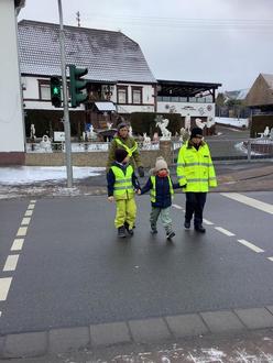 Nach dem Üben im Turnraum ging es raus auf die Straße. Mit den Kommandos „Schlange“ und „Ameise“ laufen wir erst zur Ampel. Dort wird gruppenweise geübt, über die Ampel zu gehen.