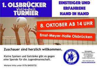 Wir laden Euch herzlich ein zum ersten Olsbrücker Alters-Mix-Turnier im Volleyball. Dieses findet statt am 8. Oktober ab 14 Uhr in der Ernst-Meyer-Halle in Olsbrücken. Wir freuen uns auf zahlreiche Zuschauer. Für das leibliche Wohl ist gesorgt.