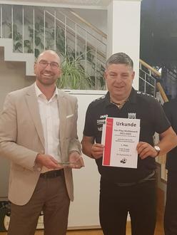 Bei der Feier am 29.09.22 in der Sparkasse Donnersberg-Rockenhausen überreichte der stellvertretende Vorstand der Sparkasse Kaiserslautern, Hartmut Bohden, den gestifteten Preis in Form einer Urkunde, einem Pokal sowie einem Scheck über 250 EUR an den Spielleiter der Aktiven Horst Schulz vom SV 1906 Katzweiler.