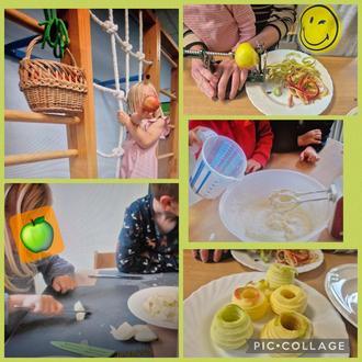 Dies war der Beginn unserer gemeinsamen Apfelreise. Das Thema „Apfel“ wird auf vielfältige Weise bearbeitet. Den Apfel mit allen Sinnen erleben ist dabei die Devise. Da wurden Äpfel als Fensterdekoration gebastelt oder auch die Räumlichkeiten schön herbstlich gestaltet. Der Duft von Apfelmuffins und –kuchen, Apfelspaghetti, Apfelmus, Apfelsaft, Apfelwaffeln, ... wehte durchs Haus. Bewegungsgeschichten und Bilderbücher sind zudem Teil des bunten Programms. Die Kinder lernten und erleben noch, wie Äpfel aussehen, riechen, schmecken und was man alles aus ihnen zubereiten kann.