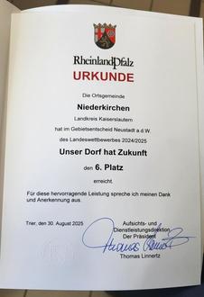 Niederkirchen hat eine wichtige Hürde genommen: Beim Landeswettbewerb „Unser Dorf hat Zukunft“ wurde die Gemeinde als Gebietssieger ausgezeichnet. In einer zentralen Feierstunde in Landstuhl überreichte ADD-Präsident Thomas Linnertz den 16 Siegern aus den Regionen Trier, Koblenz und Neustadt ihre Urkunden und Plaketten. Er lobte insbesondere das Engagement der Gemeinden, ihre Kreativität und die nachhaltigen Projekte, mit denen sie ihren Ort zukunftsorientiert entwickeln. Für Niederkirchen bedeutet dies: die Präsentation am Landesentscheid ist gesichert. Der Landesentscheid findet Ende September statt. Am 2. Oktober 2025 plant die Gemeinde selbst eine Präsentation und Leistungsschau, zu der Bürger und Vereine eingeladen sind. Ein großer Schritt für die Dorfgemeinschaft – und ein Moment, auf den man stolz sein kann.“