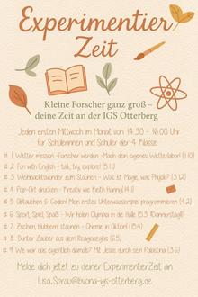 Bei Interesse melden Sie sich bitte per Mail (Lisa.Sprau@bvona-igs-otterberg) für die ExperimentierZeit an, an der Ihr Kind teilnehmen möchte.