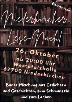 Für Samstag-Abend, 26. Oktober 2024 um 20:00 Uhr, wenn in der Westpfalzhalle in Niederkirchen alles für den Bücherbasar gerichtet sein wird, laden wir Sie herzlich ein, es sich zwischen den Büchern bequem zu machen. In ungezwungener, gemütlicher Runde möchten wir Ihnen vorlesen.