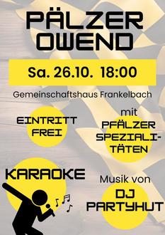 Der Förderverein der Feuerwehr Frankelbach lädt, bei freiem Eintritt, am 26. Oktober zu einem Pälzer Owend ein. Beginn ist um 18.00 Uhr im Dorfgemeinschaftshaus. Für das leibliche Wohl ist mit Pfälzer Spezialitäten gesorgt. DJ Partyhut sorgt für die musikalische Unterhaltung. Es wird auch Karaoke geben. Wer weiß, vielleicht wird ja ein Talent von morgen entdeckt? Auf Ihr Kommen freut sich die Mannschaft des Fördervereins.