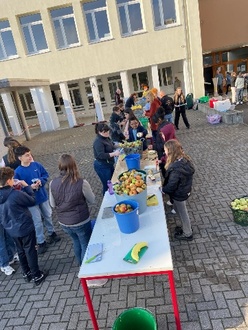 Am Wandertag sammelten die Klassen zunächst mit großem Einsatz Äpfel auf nahegelegenen Streuobstwiesen. Zwei Tage später stand das eigentliche Kelterfest auf dem Programm: Die geernteten Äpfel wurden gründlich gewaschen, geschnitten und schließlich mit einer Kelter zu frischem Apfelsaft gepresst.