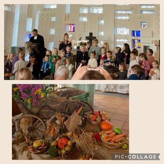 Erntedankfest: „Erntedankfest, Gott sei Dank`...“ sangen Kinder der ev. Kita „Am Himmelreich“ zu Beginn des Gottesdienstes in der prot. Christuskirche und legten dabei die Erntedgaben vorm Altar ab. Zusammen mit u.a. der „KinderKirche“ der Kirchengemeinde wurden weitere Lieder zur musikalischen Gestaltung gesungen und ein Apfelbaum gestaltet mit Gedanken, für was die Kinder dankbar sind.