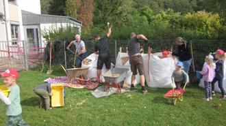 Arbeitseinsatz: „Viele Hände – bald ein Ende“ lautet ein Spruch – und so war es auch. Dank eifriger Helfer konnten Hackschnitzel (Fallschutz am Klettergerät) und etwas neuer Sand für den Sandkasten in kurzer Zeit verteilt werden. Für die Stärkung sorgte die Kita. Vielen Dank an alle Helfer und auch herzlichen Dank an die Volksbank Lauterecken, die mit ihrer Spendenaktion zur Finanzierung beigetragen hat.