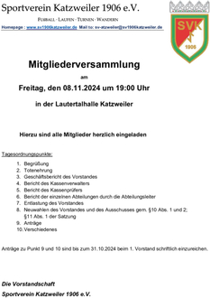 Mitgliederversammlung am Freitag, den 08.11.2024 um 19:00 Uhr in der Lautertalhalle Katzweiler