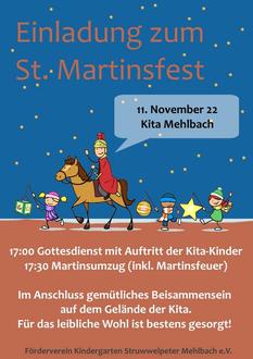 wir laden euch herzlich zu unserem Martinsfest am 11.11.2022 an der Kita Mehlbach ein. Ab 17 Uhr findet in der evangelischen Kirche Mehlbach ein Gottesdienst unter Mitwirken der Kita-Kinder statt. Im Anschluss, ab ca. 17:30 Uhr begeben wir uns auf einen Laternenumzug inklusive Martinsfeuer.