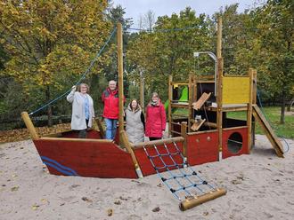 Seit Ende September ist der Spielplatz am Oberen Geißberg um eine Attraktion reicher. Ein neues Piratenschiff lädt zum Spielen ein und wird auch schon fleißig genutzt. Die offizielle Übergabe erfolgte nun im Oktober: Ellen Fahrbach und Marie-Janette Müller-Pratt, die dem alten Vorstand des Fördervereins Buntspechte angehörten, freuten sich mit Stadtbürgermeisterin Martina Stein und dem 1. Stadtbeigeordneten Martin Müller über das neue Spielgerät. „Dank der Spende in Höhe von 10.000 Euro, die vom ehemaligen Vorstand an die Stadt getätigt wurde, war es möglich, die hohen Kosten von insgesamt rund 35.000 Euro für Gerät und Aufbau zu stemmen. Deshalb geht ein herzlicher Dank an die beiden Vertreterinnen des ehemaligen Vorstands, denn ohne die Spende hätte es sicherlich noch eine Weile gedauert, bis ein neues Gerät hätte angeschafft werden können“, so Stadtbürgermeisterin Martina Stein. Neben dem Spielgerät wurden auch die anderen Geräte auf dem Spielplatz mit Ersatzteilen instandgesetzt. Nach und nach werden auch die anderen Spielplätze in Otterberg ertüchtigt. Schon da, aber noch nicht aufgebaut, ist eine Wackelbrücke für den Spielplatz oberhalb der Sparkasse. Auch bei diesem Gerät handelt es sich um eine Spende, die in diesem Fall von den Otterberger Stadthexen getätigt wurde. Der Aufbau durch den Bauhof der Verbandsgemeinde ist für November angedacht.