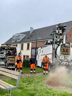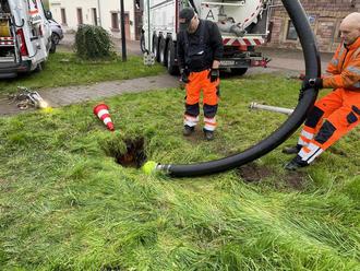 So lautete der erlösende Ausruf der Fachleute am großen Saug-Druck-Spülwagen der Firma WVE – aus Kaiserslautern am Dienstag 29.10.2024, nachdem die Ursache für die Kanalverstopfung am Bürgerhaus gefunden und beseitigt war. Ein Fußball hatte sich bei Kanalmeter 12,80 m im Querschnitt festgesetzt und somit jeglichen Wasserabfluss verhindert. Seit einigen Wochen konnte der Flutgraben am Bürgerhaus das Niederschlagswasser nicht mehr ausreichend ableiten. Das umliegende Wiesenland, die Fußwege und der große Teile des Kerweplatzes selbst waren zum Leidwesen vieler Bürger laufend überschwemmt. Denn nicht nur das Wasser und die Pfützen, sondern auch der ausgespülte Sand waren eine unangenehme Behinderung. Versuche, mit üblichem Handwerksgerät dem Problem zu Leibe zu rücken, schlugen fehl. Denn die Blockade saß tief im Rohr fest und der Rohrverlauf war nicht eindeutig nachzuvollziehen. Erst das große Saugfahrzeug konnte angeschwemmtes Geröll und Sand absaugen und das ursächliche Hindernis beseitigen. Bei der Arbeit entdeckten die Experten auch einen unterirdischen Sandfang, der sich unter dem Rasensoden befindet. Er wurde gleich mit gereinigt. Die Fachleute haben in dem Zusammenhang den Rohrleitungsverlauf neu aufgenommen, verfilmt und für die Zukunft dokumentiert. „Für den Kanaleinlauf ist ein passender Schutz in Vorbereitung, um künftiges Eindringen von solchen Fremdkörpern zu verhindern. Jedenfalls konnten wir noch rechtzeitig vor dem Martinsumzug den Kerweplatz vor weiteren Überschwemmungen schützen.“ so Ortsbürgermeister Sven Rheinheimer.