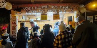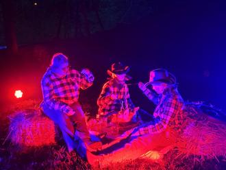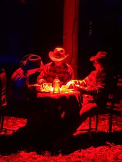 Am Abend, pünktlich um 19 Uhr, bewegt sich die Wanderschlange bestehend aus hunderten Besucher/innen Richtung Spielplatz. Über die Brücke kommend, erklingen schon schaurige Töne… „Das Lied vom Tod“ erzeugt Gänsehaut während die Cowboys Chrissi Steidel und Enisa Keim das Schiessduell eröffnen. Auf der anderen Seite wird westerngetreu gehängt und Emely Steidel hält in ihrer Rolle das Seil und Geschehen fest in ihrer Hand. Ein paar Meter weiter sitzen 3 Cowboys um einen Pferfdekopf, den sie verspeisen. Yvonne Viehweg mit ihren Töchtern Leni und Lara übernehmen dieses Schauspiel. Gegenüber wartet die letzte Gruselinstallation: 3 Cowboys sitzen bei einer schaurigen Pokerrunde am Tisch mit Karten, Drinks und es lässt einem Grübeln, ob sie noch am Leben sind. Mia Vida Keim, Jakob Klein und Miriam Keim-Lieberich lassen sich in ihrer Rolle nicht in die Karten schauen.