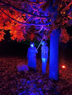 Chrissi Steidel, Vorsitzende des Fördervereins JUTZ.O e.V. betreut Wochen zuvor schon die Gruppe der Spielplatzaktion. Die aufwendige Installation bei der Gruselwanderung, bestehend aus Live Akteuren, Kulisse, Licht und Ton, läuft unter ihrer Federführung. Es wird Wochen zuvor schon gebastelt, Kostüme und Inszenierungen geprobt, sowie alles Mögliche auf die Beine gestellt, dass die Gruselwanderung wieder zum Highlight des Abends wird. Eine telefonische Dauerleitung steht im Monat Oktober zwischen ihr und Julia Pfeiffer, da beide die beiden Orte Dorfplatz und Spielplatz für das Halloweenfest in ihre Obhut nehmen.