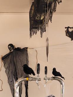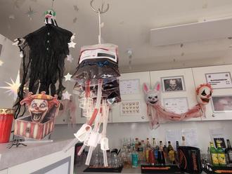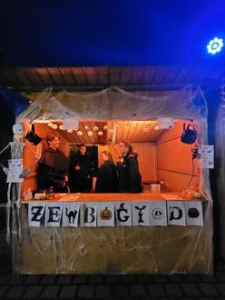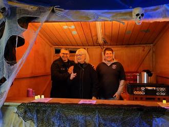 Am Morgen des großen Halloweentages trifft neben dem hilfsbereiten Team des Bauhofes, welcher schon die Hütten aufgebaut und gerichtet hat, eine weitere „Halloweeninstanz“ bewaffnet mit Werkzeugkoffer und jeder Menge Deko ein: Chrissi Steidel, Vorsitzende des Fördervereins JUTZ.O e.V. lässt es sich auch ohne Gruselwanderung nicht nehmen, ihre Rolle einzunehmen. Geschickt verwandelt sie Getränkewagen, Holzhütten und Bühne in ein tolles Gruselambiente. Als helfende Hand kommt Julia Pfeiffer mit Kollegin Patricia Brill-Schording, ebenfalls Jugendsozialarbeiterin, hinzu. Jeder Handgriff sitzt und ist willkommen. Während auf der einen Seite des Dorfplatzes dekoriert wird, bestückt Alex Franz seine mobile Cocktailbar. „Die Blutkonserven sind der Renner und heiß begehrt“, berichtet er währenddessen er diese befüllt und liebevoll platziert. Claudia Fürschke schleppt großes Gerät für den Essensstand der Phönix an. Zahlreiche Gelüste sollen am Abend gestillt werden.