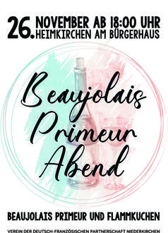 Der deutsch-französische Partnerschaftsverein Niederkirchen heißt alle herzlich willkommen zum Beaujolais Primeur Abend mit Flammkuchen am Samstag, dem 26. November ab 18:00 Uhr im und am Dorfgemeinschaftshaus Heimkirchen. Der berühmte Beaujolais Primeur ist ein spritzig-fruchtiger Rotwein aus dem französischen Anbaugebiet Beaujolais nördlich von Lyon. Er ist der erste Wein, der noch im Jahr seiner Herstellung verkauft werden darf. Traditionell erfolgt der Verkauf erst ab dem dritten Donnerstag im November und er sollte bis spätestens Ostern des folgenden Jahres getrunken sein. Es werden frisch zubereitete köstliche Flammkuchen angeboten: klassisch, vegetarisch und süß.