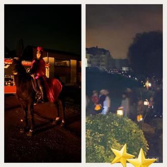 Am Abend traf man sich zum Martinsfest der Ortsgemeinde und viele Laternen erhellten den Weg hinter „St. Martin“, dem „Bettler“ und den MusikerInnen des Musikvereins durch das Ottertal bis hin zum Kerweplatz. Dort erwartete alle - Dank der Feuerwehr - ein großes Martinsfeuer und die Mantelteilung wurde auch hier zu den Klängen vom Martinslied gespielt. Gestärkt mit der Martinsbrezel (von der Ortsgemeinde traditionell für alle Kita-Kinder und teilnehmende Schulkinder der 1. Und 2. Klasse spendiert) und Punsch oder Tee oder auch Würstchen und für die Erwachsenen Glühwein, konnte man im Schein des Martinfeuers noch zusammen stehen.