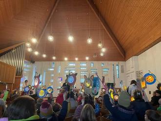 Am Vormittag des 11.11. zogen die Kinder mit ihren gebastelten Laternen in die prot. Christuskirche ein, wo einige Eltern und Prädikantin Tanja Schraß die den Gottesdienst leitete, schon auf sie warteten. Sehr lebendig wurden Laternen-Martinslieder gesungen und zum Lied „St. Martin“ spielten die Vorschulkinder auf eigenen Wunsch die Martinsgeschichte.