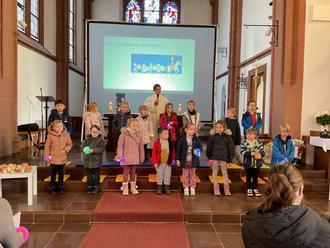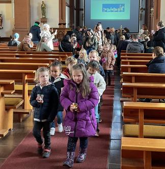 Am 11.11.2025 haben die Kinder und Erzieherinnen zum alljährigen St. Martinsgottesdienst geladen. Es haben sich zahlreiche Gottesdienstbesucher in der Kirche eingefunden, um gemeinsam mit Kindern und Erzieherinnen den guten Taten des heiligen Martin zu gedenken. Mit einem feierlichen Lichtereinlauf suchen sich die Kinder ihre Plätze, die Vorschulkinder stellen sich um den Altar. Das Lied „Sternenkinder“ singen alle gemeinsam, die gerappte Strophe übernehmen die „Vorwitznasen“ ganz alleine. Jeder in der Kirche war beeindruckt von dieser Leistung. In der Geschichte: „Die schönste Laterne der Welt“ begegnet der junge Anton einem Mann namens Martin. Dieser hilft Anton aus einer Notlage und schenkt ihm seine Laterne, so dass er am Martinsumzug teilnehmen kann. Im Anschluss richtet Frau Weber vom Pastoralteam einige Worte an die Kinder und ihre Angehörigen. Um gemeinsam das Vater unser zu beten, dürfen sich alle Kinder um den Altar stellen. Danach erzählt jede Vorwitznase, was er/sie bereit ist zu teilen. Dies wurde im Vorfeld in der Kita besprochen und von jedem Kind ein Bild dazu gemalt. Zwei Kinder dürfen gemeinsam mit Frau Taboada Prado einen Korb voller gesammelter Kleider und Spielsachen präsentieren, die von den Familien gespendet wurden. Die Spende wird der „Klääderstubb“ der Kolpingfamilie Otterbach überreicht. Danke an alle Familien, die sich beteiligt haben. Zum Abschluss singen alle das Lied „Hell wie Mond und Sterne“ und die Kinder laufen mit ihren selbstgestalteten Teelichtgläsern aus der Kirche aus. Es war ein wirklich schöner und stimmungsvoller Gottesdienst. Ein besonderer Dank geht an Frau Weber, die sich für uns Zeit genommen hat.