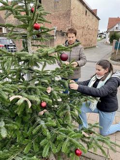 Tannengrün, festlich geschmückt mit Kugeln und Schleifen, stehen am Straßenrand und lassen uns daran erinnern, dass es bald Weihnachten ist. Es war Silvia Plößner und ihre Enkelin Marlene, die sich dafür eingesetzt hatten, dass die Gemeinde wieder Tannenbäume an markanten Straßenpunkten aufgestellt hat. Denn Ortsbürgermeister Sven Rheinheimer war von der Idee so begeistert, dass er selbst mit Hand angelegt hat. Mit viel Liebe und Geschick machten sich die beiden Damen an die Arbeit und sie haben die meisten der Tannen mit eigenem Material verschönert. Dabei gab es viel Zuspruch von den Anwohnern und noch mehr Materialspenden. Schleifen in Gold und in Rot, glänzende Kugeln und vielerlei Deko steuerten die Menschen aus der Nachbarschaft mit bei. Kreativität kann dann auch ansteckend sein. Denn an so mancher Ecke haben Eltern mit ihren Kindern, oder Großeltern mit den Enkeln auch begonnen, vor der Haustür eine Straßentanne zu schmücken. „ Ein schönes Beispiel, das gerne Schule machen darf“, so der Bürgermeister.