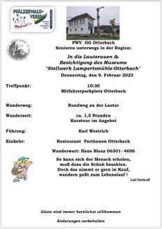 Der Pfälzerwald-Verein Ortsgruppe Otterbach lädt zur Seniorenwanderung am 9. Februar 2023 ein. Treffpunkt ist um 10:30 Uhr auf dem Mitfahrerparkplatz Otterbach. Der Wanderweg führt in die Lauterauen mit Besichtigung des Museums „Stellwerk Lampertsmühle-Otterbach“. Geschätzte Wanderzeit: ca. 1,5 Stunden. Eine Kurztour ist ebenfalls im Angebot. Die Führung übernimmt Karl Westrich, Wanderwart ist Hans Blanz. Im Anschluss ist die Einkehr ins Restaurant Parthenon in Otterbach geplant.