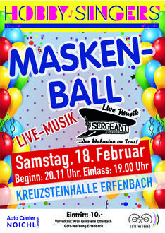 Am Samstag, 18. Feb. 2023 findet erstmalig seit 2019 wieder ein Maskenball der Hobby-Singers in der Kreuzsteinhalle in Erfenbach statt. Entgegen der früheren Gewohnheiten steht diese Veranstaltung unter keinem besonderen Motto. Die Gäste sollen maskiert kommen und einfach nur gute Laune mitbringen. Die Tanzmusik der Live-Band Sergeant beginnt um 20:11 Uhr, jedoch ist bereits ab 19:00 Uhr Einlass. Die Eintrittskarten können für 10,00 EUR im Vorverkauf bei der Aral-Tankstelle Noichl in Otterbach oder bei der Firma Götz-Werbung in Erfenbach gekauft werden. Selbstverständlich gibt es auch Karten an der Abendkasse.
