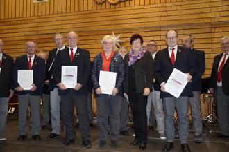 Der Männergesangverein mit Burkhard Schohl als Dirigent hatte 2 Auftritte - im Ersten übernahm Irene Poller vom Kreischorverband wichtige Ehrungen für 25 Jahre, 40 Jahre und 60 Jahre aktives Singen sowie für 50 Jahre Chorleitertätigkeit von Burkhard Schohl vor. Umrahmt von zwei Liedern bekam die Ehrung den richtigen Rahmen.