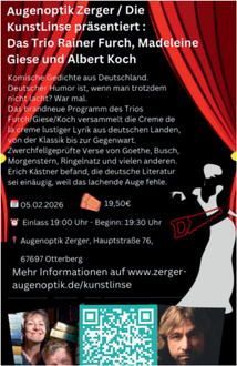 Otterberg. Am 05.02.2026 lädt Augenoptik Zerger zu dem literarisch-humorvollen Abend „Die zersägte Dame“ ein. Das Trio Furch/Giese/Koch präsentiert humorvolle Lyrik von der Klassik bis zur Gegenwart. Beginn 19:30 Uhr, Eintritt 19,50 Euro. Der Gewerbeverein Otterberg e. V. wünscht viel Vergnügen.