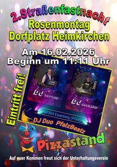 Der Unterhaltungsverein Blau-Weiß Heimkirchen lädt alle Närrinnen und Narren zur 2. Straßenfasnacht auf dem Dorfplatz in Heimkirchen ein.