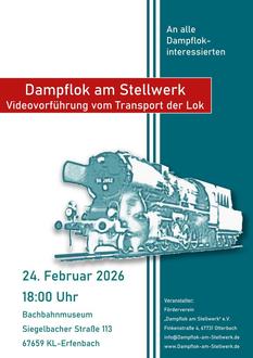 Wir wollen den großen Tag des Dampflok-Transports nochmal Revue passieren lassen und zeigen den Videofilm, der bei dieser Aktion gedreht wurde. Hierzu sind alle Dampflok- und Eisenbahninteressierte herzlich eingeladen. Beginn am 24. Februar ist um 18:00 Uhr im Bachbahnmuseum in Erfenbach. Im Anschluss an den Film besteht noch die Möglichkeit, in geselliger Runde ins Gespräch zu kommen und noch etwas zu verweilen.
