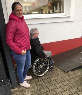 Die Geschäftsführerin der Firma ZEMO, Eva Moser, mit Markus Höh an der Rollstuhlrampe des Ladens.