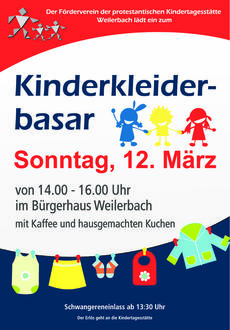 Der Förderverein der protestantischen Kindertagesstätte veranstaltet am 12.3.2023 einen Kinderkleiderbasar im Bürgerhaus in Weilerbach. Der Basar findet statt von 14 bis 16 Uhr, für Schwangere öffnen die Pforten bei Vorlage des Mutterpasses bereits um 13.30 Uhr. Neben den Verkaufsartikeln für Kinder erwartet die Besucher ein großer Kuchen- und Tortenverkauf. Die Einnahmen sind zugunsten der protestantischen Kita
