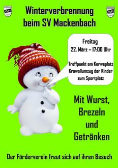 Am Sportplatz lädt dann der Förderverein vom SV Mackenbach zur Verbrennung des Winters ein. Dazu singen die Kinder der kommunalen Kita. Mit weiteren Angeboten an Speisen und Getränken unterstützt der Elternausschuss der Kita und der Dorfförderverein die Veranstaltung.
