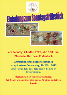Am Sonntag, 23 März, lädt der Katholische Frauenkreis Rodenbach e. V. wieder zum Sonntagsfrühstück ins Pfarrheim Herz Jesu ein.