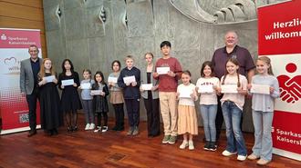Zu sehen sind neben dem Ersten Kreisbeigeordneten Jan Schneider (Landkreis Kaiserslautern) und dem Beigeordneten Klaus Urschel (VG Weilerbach) u. a. die Jugendlichen: Moore, Faustina; Ha, Soul; Cossmann, Leni; Magill, Lily; Schmidt, Felice Sophie; Thilman, Jacob; Thilman, Tatiana; Yang, Anthony Jiasheng; Janzen, Louisa; Janzen, Sophia; Janzen, Emilia; Meier, Laetitia
