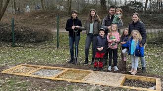 Bereits Tage zuvor waren die Kinder fleißig dabei, die Holzbalken mit Wetterschutzlasur zu bestreichen. Am Samstag konnten diese dann zu dem Grundgerüst verschraubt werden. Nachdem der Boden ausgehoben war, konnte dann der Barfußpfad eingelassen und von den Kindern befüllt werden. Sie testeten die neue Attraktion natürlich gleich ausgiebig. Am Mittwoch, den 06.03.2024 entdeckten schließlich auch alle anderen Kinder der Einrichtung den neuen Barfußpfad. Stolz wurde dieser von den „Helferkindern“ präsentiert und alle hatten eine Menge Spaß daran, den Weg auf und ab zu laufen.