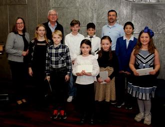 Erste Kreisbeigeordnete Gudrun Heß-Schmidt, Ortsbürgermeister Horst Bonhagen (Weilerbach), Ortsbürgermeister Markus Schick (Rodenbach) mit den Preisträgerinnen und Preisträgern: Gene Sutheerarak, Ariana Wooldridge, Jacob Thilman, Tatiana Thilman, Emilia Janzen, Sophia Janzen, Philipp Janzen, Julian Janzen und Maya Klemens. Foto: Günter Kries
