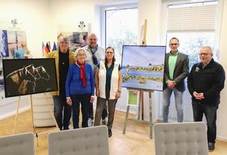 Die Kunstschaffenden Ulrike A. Freitag, Elke Reiß, Roger Graff und Monika Loll (von links nach rechts) mit Bürgermeister Ralf Schwarm (2. von rechts) und dem Tourismus- und Kulturbeauftragten Volker Halfmann (ganz rechts).