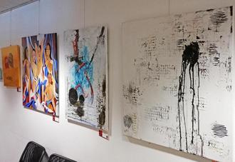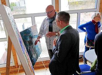 Beim anschließenden Gang durch die Ausstellung im Erdgeschoss bestand die Gelegenheit, mit den Künstlern ins Gespräch zu kommen. Ulrike Freitags Leidenschaft für Pferde zeigt sich auch in ihren Ölgemälden, Monika Loll ist mit lichten Aquarellbildern vertreten, Elke Reiß präsentiert farbenfrohe Gemälde im Stil der Expressionistin Gabriele Münter und Roger Graff experimentiert bei seinen großformatigen Bildern mit Epoxitharz.