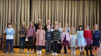 Den Großteil des Programms gestalteten die Klavierschüler von Larissa Olevska, Irina Schindel und Dieter Schmidt. In alphabetischer Reihenfolge waren dies Mingxi Cao, Liam Dietrich, Luisa Gerum, Sophie Koll, Aurora Packullat, Camilla Panig, David und Robert Putnam, Ben Richter, Jule Schubert, Julia und Laura Schulenburg, Sophia Yufei Shi, Helena Sweigart und Iris Weingeroff. Die Bandbreite der Darbietungen reichte dabei von einfachen Kinderliedern wie „Backe, backe Kuchen“ bis zu klassischen Werken von Clementi und Beethoven. Erstmals seit vielen Jahren vertreten waren Schülerinnen der Harfenklasse von Jennifer Stratmann-Fliedner. Elisabeth Schäfer und Lou McDonagh sorgten mit ihrem Spiel für einen besonderen klanglichen Farbtupfer.