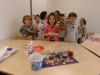 Spielerisch und mit viel Freude führen die Kinder kleine Experimente durch, beobachten verschiedene Materialien und stellen dabei viele Fragen. Warum schwimmen manche Dinge im Wasser und andere gehen unter? Was passiert, wenn man Farben mischt? Solche und ähnliche Fragen stehen im Mittelpunkt.