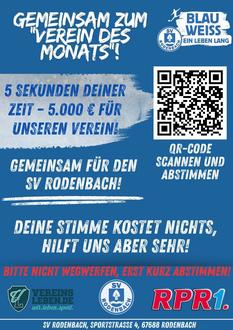 Im April 2026 nimmt der SV Rodenbach am Wettbewerb "Verein des Monats" teil, der von RPR1. und Vereinsleben.de veranstaltet wird. Dabei tritt der Verein gegen vier weitere Vereine an, am Ende entscheidet die Anzahl der gesammelten Stimmen über den Sieg. Dem Gewinner winkt eine Förderung von bis zu 5.000 € für die Vereinsarbeit.