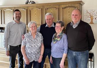 v.l. Ortsbürgermeister Schick, die Jubilarin mit Ehemann, Familie Blauth als Gratulanten