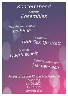Nach drei gelungenen Veranstaltungen in den Jahren 2019, 2020 und 2023 wird auch im Jahre 2024 das "Konzert kleiner Ensembles" wieder stattfinden. So werden am Sonntag, dem 14.04.2024, das Holzbläserensemble "boiSSon", das "HSB Sax Quartett", das Bläserquintett "Querblechein" und das Blechbläserquintett des MV Mackenbach zu hören sein.