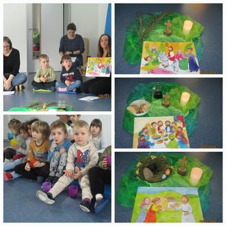 Am Gründonnerstag feierten die Kinder und Erzieherinnen nach einem gemütlichen Osterfrühstück mit einer kleinen Andacht das Osterfest. Die Kinder hörten und erlebten die Geschichten von Jesus Einzug in Jerusalem, die Feier des letzten Abendmahls und Jesus Auferstehung. Danach gingen die Kinder in ihre Gruppen und durften ihren Osterhasen suchen.