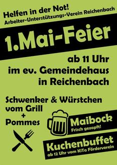 Auch in diesem Jahr veranstaltet der Arbeiter-Unterstützungs-Verein seine traditionelle Feier am 1. Mai rund um das Evangelische Gemeindehaus in Reichenbach. Ab 11:00 Uhr werden wieder Bierspezialitäten sowie Leckereien vom Grill und Pommes für den herzhaften Genuss angeboten. Wie im vergangenen Jahr konnte der AUV den Förderverein Kita Lummerland e.V. für ein Küchenbuffet gewinnen (was uns sehr freut). Ab 12:00 Uhr werden dann dort Kaffee und allerlei leckere Kuchen auf die Besucher warten.