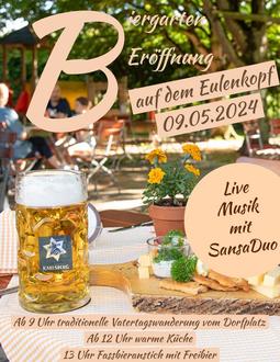 Es geht wieder los, wir starten unsere Biergarten-Saison auf dem Eulenkopf am Donnerstag, den 09.05.24 mit Live Musik und Fassbieranstich.