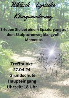 Die ev. Kirchengemeinde lädt herzlich zur ersten biblisch-lyrischen Klangwanderung in Rodenbach ein. Wir treffen uns um 18:00 Uhr an der Grundschule in Rodenbach und wandern zusammen bis zum Wasserhaus. Unterwegs werden gemeinsam auf Texte und Klänge hören und sie auf uns wirken lassen. Sie sind herzlich Willkommen.